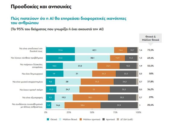 Ακόμα ένα σημείο όπου φαίνεται μια τέτοια διαφορά στις αντιλήψεις είναι οι προσδοκίες από την ΑΙ. Συνολικά, οι απαντήσεις που συγκεντρώνουν περισσότερο από 50% στις θετικές προσδοκίες συνδέονται με την παραγωγικότητα και με συναφείς δεξιότητες. Περισσότεροι από τους μισούς θεωρούν ότι η ΑΙ θα βοηθήσει στο να είμαστε παραγωγικοί στη δουλειά μας, να λύνουμε σύνθετα προβλήματα, να παίρνουμε δύσκολες αποφάσεις και να είμαστε δημιουργικοί. Αντιθέτως, περισσότεροι ερωτώμενοι θεωρούν ότι λειτουργίες που έχουν σχέση με τον συναισθηματικό κόσμο (να είμαστε ψυχικά ισορροπημένοι, να είμαστε εξωστρεφείς ή να συνδεόμαστε συναισθηματικά με άλλους ανθρώπους) θα επηρεαστούν αρνητικά. Ξεκάθαρα περισσότεροι θεωρούν ότι θα πληγεί, επίσης, η ικανότητα της κριτικής σκέψης.