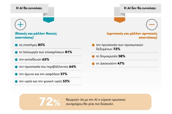 Τέλος, κατ’ αντιστοιχία με τα μεγάλα ποσοστά απαισιόδοξων για το πώς η ΑΙ θα επηρεάσει τη συναισθηματική σύνδεση με τους άλλους ανθρώπους, το ίδιο συμβαίνει και στις αναμενόμενες αλλαγές στην εύρεση ερωτικού συντρόφου: 72% θεωρεί ότι με την ΑΙ θα γίνει πιο δύσκολη.