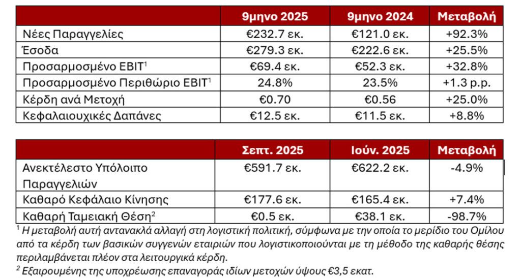 • Η ισχυρή εισροή νέων παραγγελιών συνεχίστηκε, με τις νέες παραγγελίες να ανέρχονται σε €232,7 εκατ. κατά το 9μηνο του 2025, σημειώνοντας αύξηση 92% σε σύγκριση με το αντίστοιχο διάστημα του 2024. Επιπλέον, προστέθηκαν πρόσθετα δικαιώματα αγοράς ύψους €150 εκατ., τα οποία παρουσιάζουν υψηλή πιθανότητα μετατροπής σε ανεκτέλεστο υπόλοιπο παραγγελιών τα επόμενα έτη.
