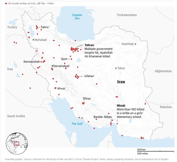 Το Ισραήλ πραγματοποίησε ένα κύμα αεροπορικών επιδρομών εναντίον ιρανικών στόχων ασφαλείας και της Χεζμπολάχ στη Βηρυτό, καθώς η Τεχεράνη απείλησε με «πλήρη καταστροφή της στρατιωτικής και οικονομικής υποδομής της περιοχής», καθώς ο ραγδαία κλιμακούμενος πόλεμος εισήλθε στην πέμπτη ημέρα του και έφτασε μέχρι τον Ινδικό Ωκεανό στα ανοικτά της Σρι Λάνκα.