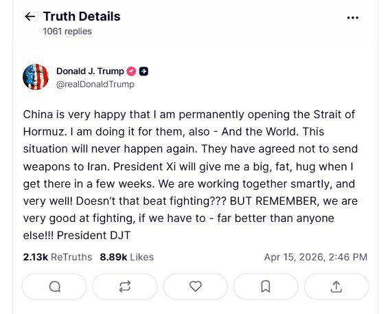 Στην ανάρτησή του ο Αμερικανός Πρόεδρος επισημαίνει ότι «η Κίνα είναι πολύ χαρούμενη που ανοίγω μόνιμα τα Στενά του Ορμούζ. Το κάνω και για αυτούς — αλλά και για τον κόσμο. Αυτή η κατάσταση δεν θα συμβεί ποτέ ξανά. Έχουν συμφωνήσει να μη στέλνουν όπλα στο Ιράν. Ο Σι Τζινπίνγκ θα μου δώσει μια μεγάλη, θερμή αγκαλιά όταν φτάσω εκεί σε λίγες εβδομάδες. Συνεργαζόμαστε έξυπνα και πολύ καλά! Δεν είναι αυτό καλύτερο από το να πολεμάμε;;; ΑΛΛΑ ΝΑ ΘΥΜΑΣΤΕ, είμαστε πολύ καλοί στο να πολεμάμε, αν χρειαστεί — πολύ καλύτεροι από οποιονδήποτε άλλο!!! Πρόεδρος DJT»