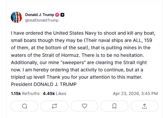 Με νέα εμπρηστική ανάρτηση στην πλατφόρμα Truth Social, ο Ντόναλντ Τραμπ δήλωσε ότι έδωσε εντολή στο Πολεμικό Ναυτικό των ΗΠΑ να ανοίγει πυρ και να βυθίζει οποιοδήποτε σκάφος τοποθετεί νάρκες στα Στενά του Ορμούζ.