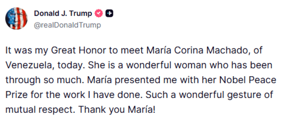 Σε μια ανάρτηση στα μέσα κοινωνικής δικτύωσης την Πέμπτη το βράδυ, ο Τραμπ έγραψε: «Η Μαρία μου χάρισε το Νόμπελ Ειρήνης για το έργο που έχω επιτελέσει. Μια υπέροχη χειρονομία αμοιβαίου σεβασμού. Σ’ ευχαριστώ, Μαρία!».