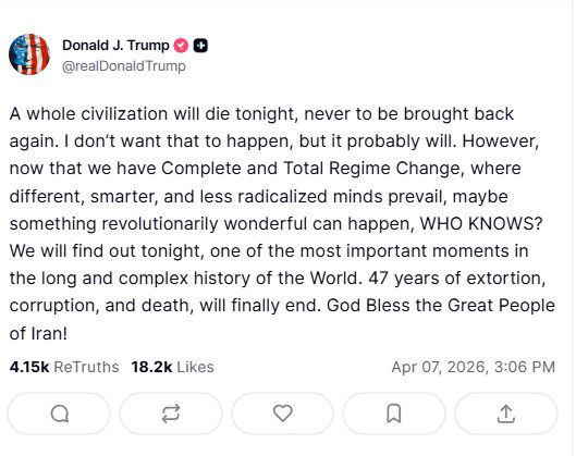 Με μια ακομα εμπρηστική ανάρτηση για το Ιράν, ο Αμερικανός πρόεδρος μιλά για το τέλος «ολόκληρου πολιτισμού» μέσα σε ένα βράδυ και παρουσιάζει το ενδεχόμενο συντριβής ως ιστορική ευκαιρία για «κάτι επαναστατικά υπέροχο».