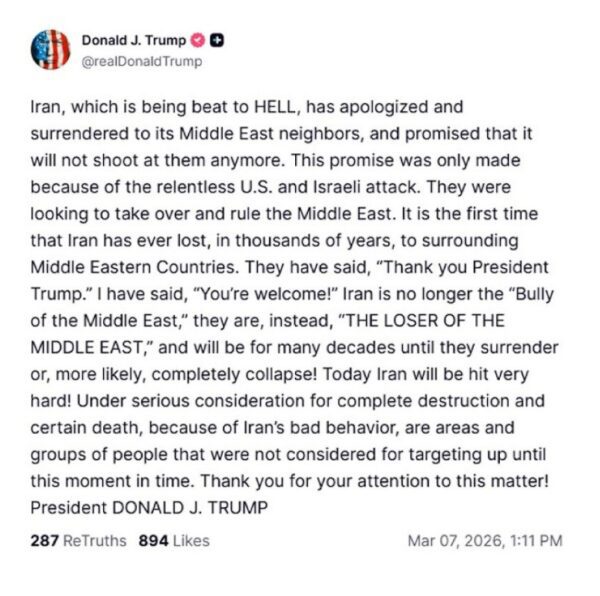 «Το Ιράν, το οποίο δέχεται σφοδρά πλήγματα, έχει ζητήσει συγγνώμη και έχει παραδοθεί στους γείτονές του στη Μέση Ανατολή και υποσχέθηκε ότι δεν θα τους πυροβολήσει ξανά. Αυτή η υπόσχεση δόθηκε μόνο εξαιτίας των αδιάκοπων επιθέσεων των ΗΠΑ και του Ισραήλ. Επιδίωκαν να καταλάβουν και να κυριαρχήσουν στη Μέση Ανατολή. Είναι η πρώτη φορά που το Ιράν, σε χιλιάδες χρόνια, έχει ηττηθεί από τα γύρω κράτη της Μέσης Ανατολής. Έχουν πει: «Ευχαριστούμε, Πρόεδρε Τραμπ». Και εγώ είπα: «Παρακαλώ!»