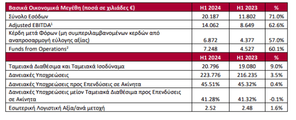Τα Κεφάλαια από Λειτουργικές Δραστηριότητες (Funds from Operations) ανήλθαν σε 7,3 εκατ. ευρώ έναντι 4,5 εκατ. ευρώ (αυξημένα κατά 60,1%) σε σχέση με το Α’ Εξάμηνο 2023.