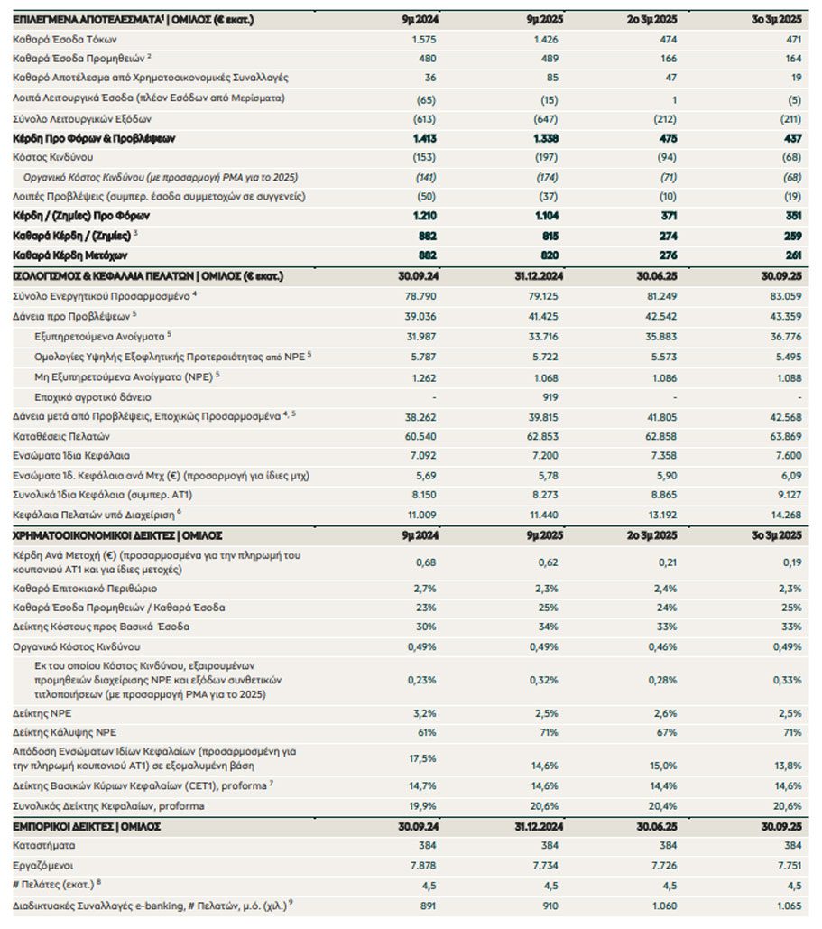 • €36,8 δισ. δάνεια, αυξημένα κατά €3,1 δισ. στο εννεάμηνο. Η ισχυρή επίδοση οδηγεί σε αναπροσαρμογή του στόχου για το 2025 στα >€37,3 δισ. δάνεια
