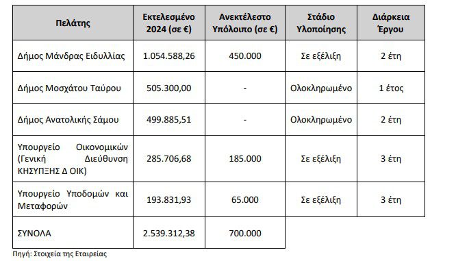 Η εξάρτηση με το δημόσιο και την τοπική αυτοδιοίκηση είναι μεγάλη, καθώς οι πέντε μεγαλύτεροι πελάτες της είναι δήμοι και υπουργεία: Δήμος Μάνδρας Ειδυλλίας, Δήμος Μοσχάτου Ταύρου, Δήμος Ανατολικής Σάμου, Υπουργείο Οικονομικών (Γενική Διεύθυνση) και Υπουργείο Υποδομών και Μεταφορών: