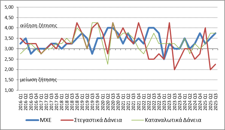 Κατά το γ΄ τρίμηνο του 2025, η συνολική ζήτηση δανείων από τις ΜΧΕ αυξήθηκε, αφενός λόγω χρηματοδοτικών αναγκών αφετέρου λόγω διεύρυνσης των εναλλακτικών πηγών χρηματοδότησης.