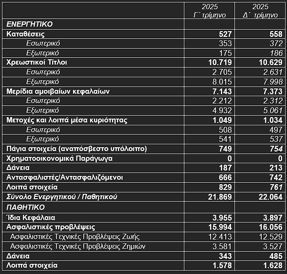 Από την πλευρά του παθητικού, τα ίδια κεφάλαια μειώθηκαν στα 3.897 εκατ. ευρώ στο τέλος του δ΄ τριμήνου του 2025, έναντι 3.955 εκατ. ευρώ το προηγούμενο τρίμηνο. Οι ασφαλιστικές τεχνικές προβλέψεις αυξήθηκαν κατά 62 εκατ. ευρώ και διαμορφώθηκαν στα 16.056 εκατ. ευρώ. Αναλυτικότερα, οι ασφαλιστικές τεχνικές προβλέψεις ζωής αυξήθηκαν κατά 116 εκατ. ευρώ και διαμορφώθηκαν στα 12.529 εκατ. ευρώ, ενώ οι τεχνικές προβλέψεις ζημιών μειώθηκαν κατά 54 εκατ. ευρώ και διαμορφώθηκαν στα 3.527 εκατ. ευρώ. Από το σύνολο των τεχνικών προβλέψεων, το 78,0% αντιστοιχεί σε τεχνικές προβλέψεις ζωής.