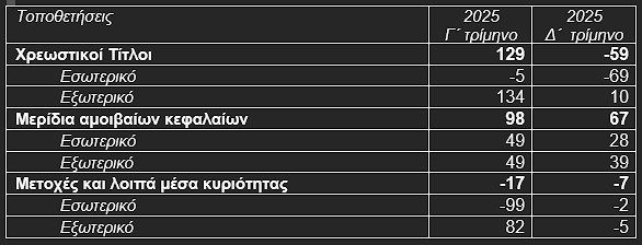Η αξία των συνολικών τοποθετήσεων σε μερίδια αμοιβαίων κεφαλαίων αυξήθηκε στα 7.373 εκατ. ευρώ, έναντι 7.143 εκατ. ευρώ το προηγούμενο τρίμηνο, και το ποσοστό τους επί του συνόλου του ενεργητικού αυξήθηκε στο 33,4% το δ΄ τρίμηνο του 2025, έναντι 32,7% το προηγούμενο τρίμηνο. Η αύξηση της αξίας των τοποθετήσεων οφείλεται κυρίως σε άνοδο των αποτιμήσεων μεριδίων του εξωτερικού και του εσωτερικού.