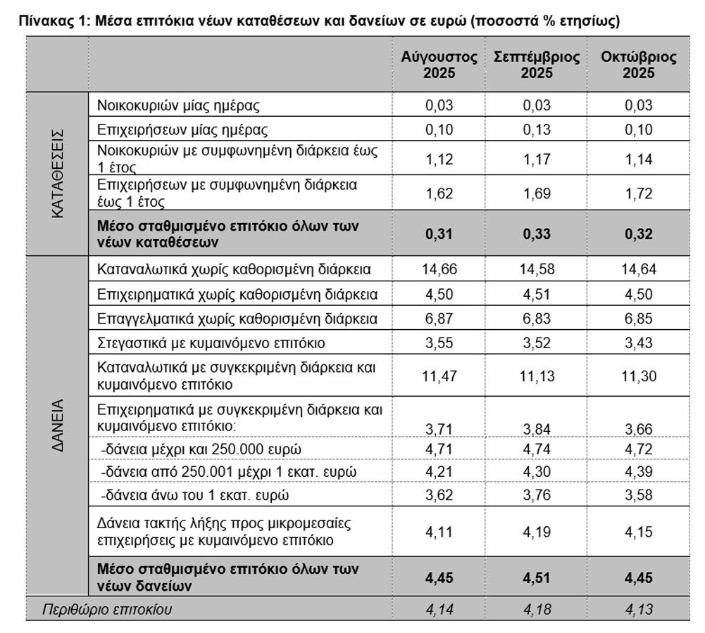 Τον Οκτώβριο του 2025, το μέσο σταθμισμένο επιτόκιο του συνόλου των νέων καταθέσεων παρέμεινε σχεδόν αμετάβλητο, σε σχέση με τον προηγούμενο μήνα, και διαμορφώθηκε στο 0,32%, σύμφωνα με στοιχεία τη Τράπεζας της Ελλάδος.