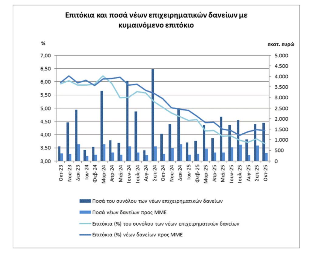 Το μέσο σταθμισμένο επιτόκιο του συνόλου των νέων δανείων προς νοικοκυριά και επιχειρήσεις μειώθηκε κατά 6 μονάδες βάσης και διαμορφώθηκε στο 4,45%.