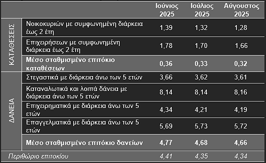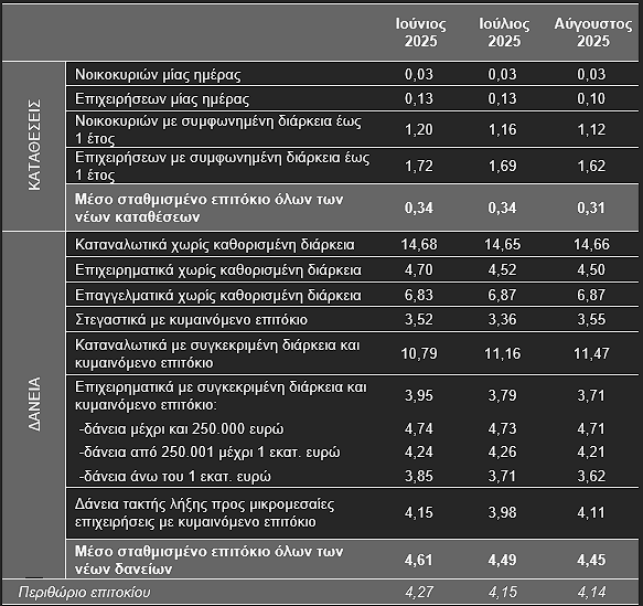 Τον Αύγουστο του 2025, το μέσο σταθμισμένο επιτόκιο του συνόλου των νέων καταθέσεων μειώθηκε κατά 3 μονάδες βάσης, σε σχέση με τον προηγούμενο μήνα, και διαμορφώθηκε στο 0,31%.