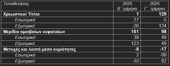 Η αξία των συνολικών τοποθετήσεων σε μετοχές και λοιπά μέσα κυριότητας μειώθηκε στα 1.049 εκατ. ευρώ, έναντι 1.057 εκατ. ευρώ το προηγούμενο τρίμηνο, εξέλιξη που οφείλεται κυρίως σε καθαρές πωλήσεις μετοχών του εσωτερικού, οι οποίες αντισταθμίστηκαν εν μέρει από καθαρές αγορές μετοχών του εξωτερικού. Το ποσοστό των συνολικών τοποθετήσεων σε μετοχές επί του συνόλου του ενεργητικού παρέμεινε σχεδόν αμετάβλητο στο 4,8% το γ΄ τρίμηνο του 2025.
