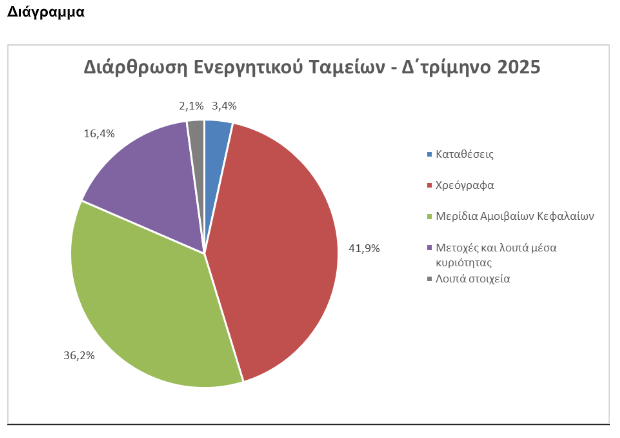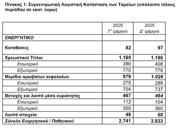 Η αξία των συνολικών τοποθετήσεων σε μερίδια αμοιβαίων κεφαλαίων αυξήθηκε στα 1.026 εκατ. ευρώ στο τέλος του δ΄ τριμήνου του 2025, έναντι 979 εκατ. ευρώ το προηγούμενο τρίμηνο. Η αύξηση της αξίας των τοποθετήσεων οφείλεται κυρίως σε καθαρές αγορές, αλλά και σε άνοδο των αποτιμήσεων μεριδίων του εξωτερικού. Το ποσοστό των τοποθετήσεων σε μερίδια αμοιβαίων κεφαλαίων επί του συνόλου του ενεργητικού αυξήθηκε στο 36,2%, έναντι 35,7% το προηγούμενο τρίμηνο.