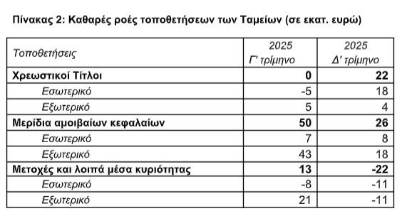 Η αξία των συνολικών τοποθετήσεων σε μετοχές και λοιπά μέσα κυριότητας διαμορφώθηκε σε 464 εκατ. ευρώ στο τέλος του δ΄ τριμήνου του 2025, έναντι 467 εκατ. ευρώ το προηγούμενο τρίμηνο. Η εξέλιξη αυτή οφείλεται σε καθαρές πωλήσεις μετοχών του εσωτερικού και του εξωτερικού, οι οποίες αντισταθμίστηκαν σχεδόν στο σύνολο τους από άνοδο των αποτιμήσεων στο σύνολο των μετοχών. Το ποσοστό των τοποθετήσεων σε μετοχές επί του συνόλου του ενεργητικού μειώθηκε στο 16,4%, το δ΄ τρίμηνο του 2025, έναντι 17,0% το προηγούμενο τρίμηνο.