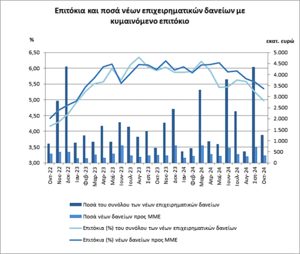 Τον Οκτώβριο του 2024, το μέσο σταθμισμένο επιτόκιο των νέων καταθέσεων παρέμεινε σχεδόν αμετάβλητο στο 0,53%, ενώ το αντίστοιχο επιτόκιο των νέων δανείων μειώθηκε στο 5,41%, σύμφωνα με τα στοιχεία της Τράπεζας της Ελλάδος (ΤτΕ), ενώ το περιθώριο επιτοκίου μεταξύ των νέων καταθέσεων και δανείων μειώθηκε στις 4,88 εκατοστιαίες μονάδες.