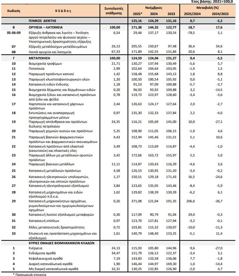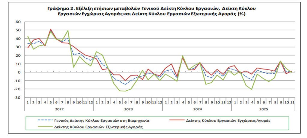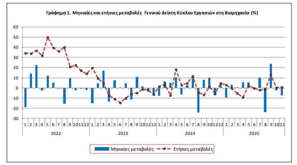 Ο Γενικός Δείκτης Κύκλου Εργασιών στη Βιομηχανία (σύνολο εγχώριας και εξωτερικής αγοράς) του μηνός Νοεμβρίου 2025, σε σύγκριση με τον αντίστοιχο δείκτη του Νοεμβρίου 2024, παρουσίασε αύξηση 0,7% έναντι μείωσης 5,2% που σημειώθηκε κατά την αντίστοιχη σύγκριση του έτους 2024 με το 2023.