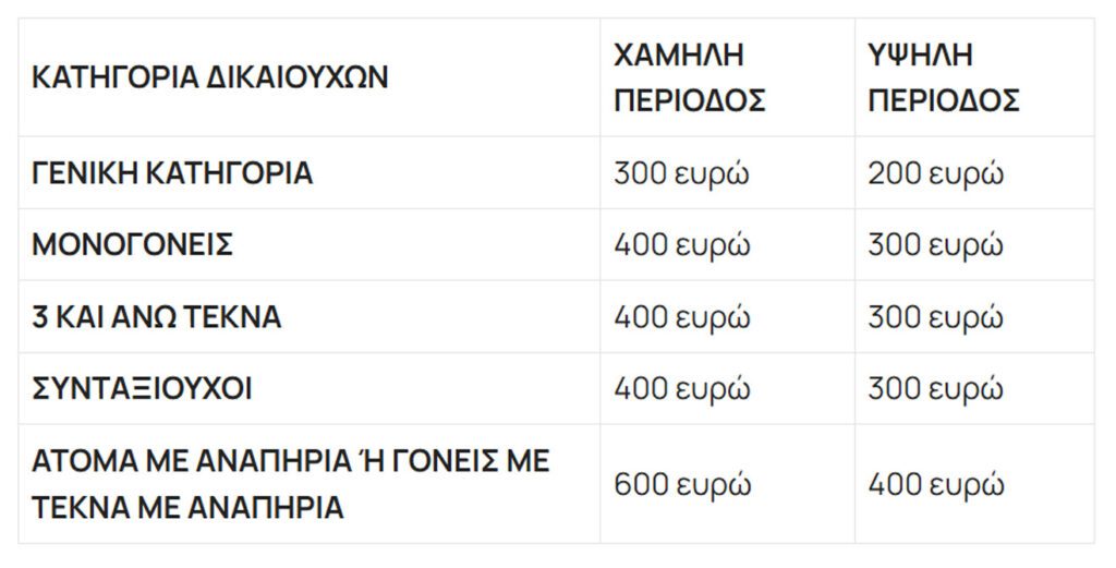 Ειδικότερα, τα ποσά ενίσχυσης για την Χαμηλή Περίοδο (από την ημερομηνία έκδοσης της κάρτας – 30.04.2025 & 01.10.2025 – 31.12.2025) και την Υψηλή Περίοδο (01.05.2025 – 30.09.2025) διαμορφώνονται ως εξής: