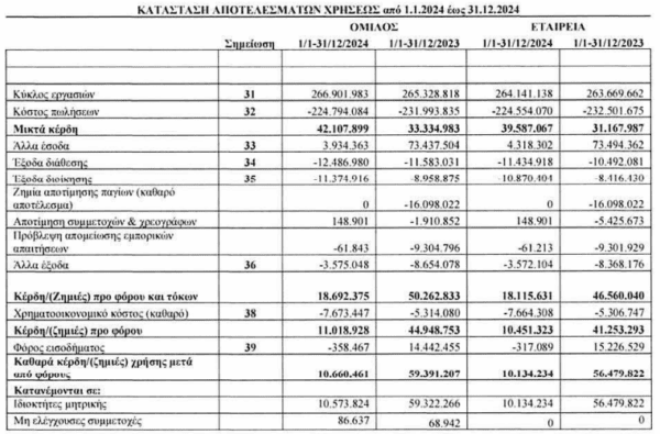 Εξάλλου, σύμφωνα με τις οικονομικές καταστάσεις, τα καθαρά κέρδη/(ζημιές) χρήσης μετά από φόρους ανήλθαν σε 10, 6 εκατ. ευρώ, μειωμένα από τα 59,3 εκατ. το 2023, για τον όμιλο, ενώ για την εταιρεία άγγιξαν τα 10,1 εκατ. ευρώ, ελαττωμένα από τα 56,4 εκατ. ευρώ το 2023.