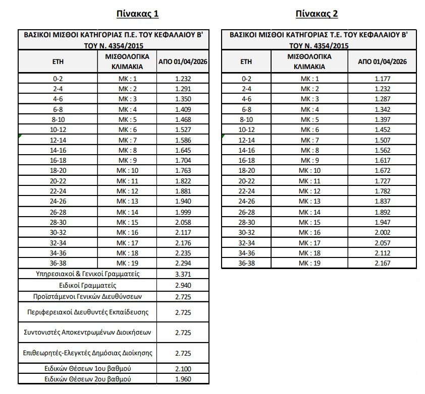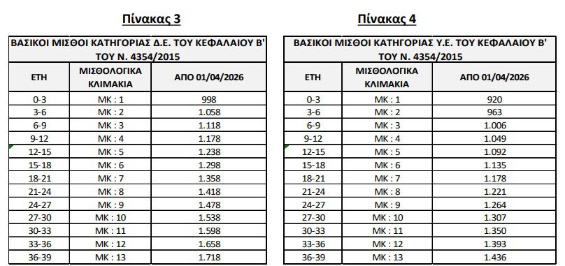 Ως εκ τούτου, ο εισαγωγικός βασικός μισθός στο Δημόσιο, που λαμβάνεται από νεοπροσληφθέντα υπάλληλο της κατηγορίας της Υποχρεωτικής Εκπαίδευσης (Υ.Ε.) και ο οποίος ήταν 880 ευρώ, από την 1η Απριλίου 2026 ανέρχεται και αυτός στα 920 ευρώ, ώστε να είναι ίσος με τον κατώτατο μισθό του ιδιωτικού τομέα.
